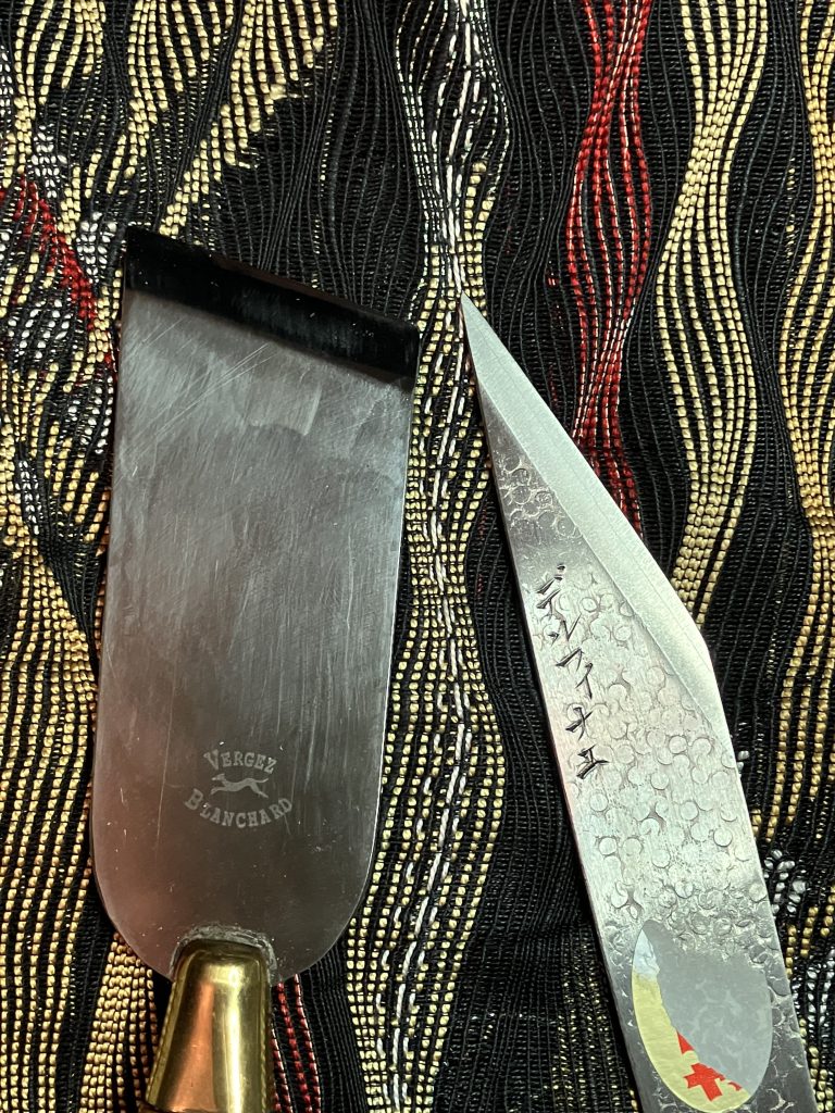 J’ai travaillé avec un couteau à parer de style et de marque française, avec un manche depuis mon apprentissage, et j’ai recemment choisi un couteau sans manche et de style japonais. J’ai testé un couteau sans manche il y a quelques années, ma prise en main était meilleure et donc le rendu aussi. Ensuite, j’ai profité de mon voyage au Japon pour me procurer un couteau à parer avec un bel acier, et j’avoue que je ne regrette pas mon choix. L’affutage est facile et rapide, et le résultat du parage est magnifique.